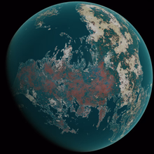 With a vast plethora of different biomes, many tourists and travelers have remarked Vondya’s surface to be diverse and unique, with its formerly underwater features showing a contrasting palette of colors. These colors, such as the red rustic mountains, come from Vondya’s seabeds originally being filled with iron oxide. Iron oxide is also the reason as to why Vondya’s former ocean was red.